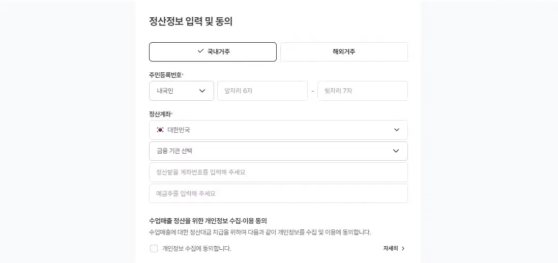티쳐꾸그 서비스 계약 약관 동의 및 정산 정보를 입력해 주셔야 합니다.