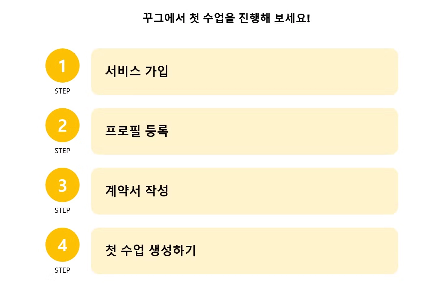꾸그에서 수업 진행을 원하시는 모든 선생님은 [티쳐꾸그 회원가입 > 프로필 등록 > 계약서 작성]의 간단한 절차를 거쳐 바로 수업을 오픈하실 수 있으며, 오픈 이후 스케줄 및 수업 관리까지 편리하게 이용하실 수 있습니다.