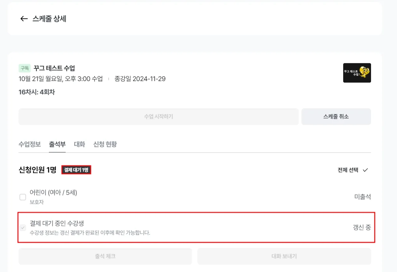 하지만 이전에 테스트를 위해 수업에 미리 참여했던 수강생이 실제 수업 시간에 결석하는 경우들도 있기 때문에 이미 체크된 수강생들도 꼭 재확인해 주시길 바랍니다.