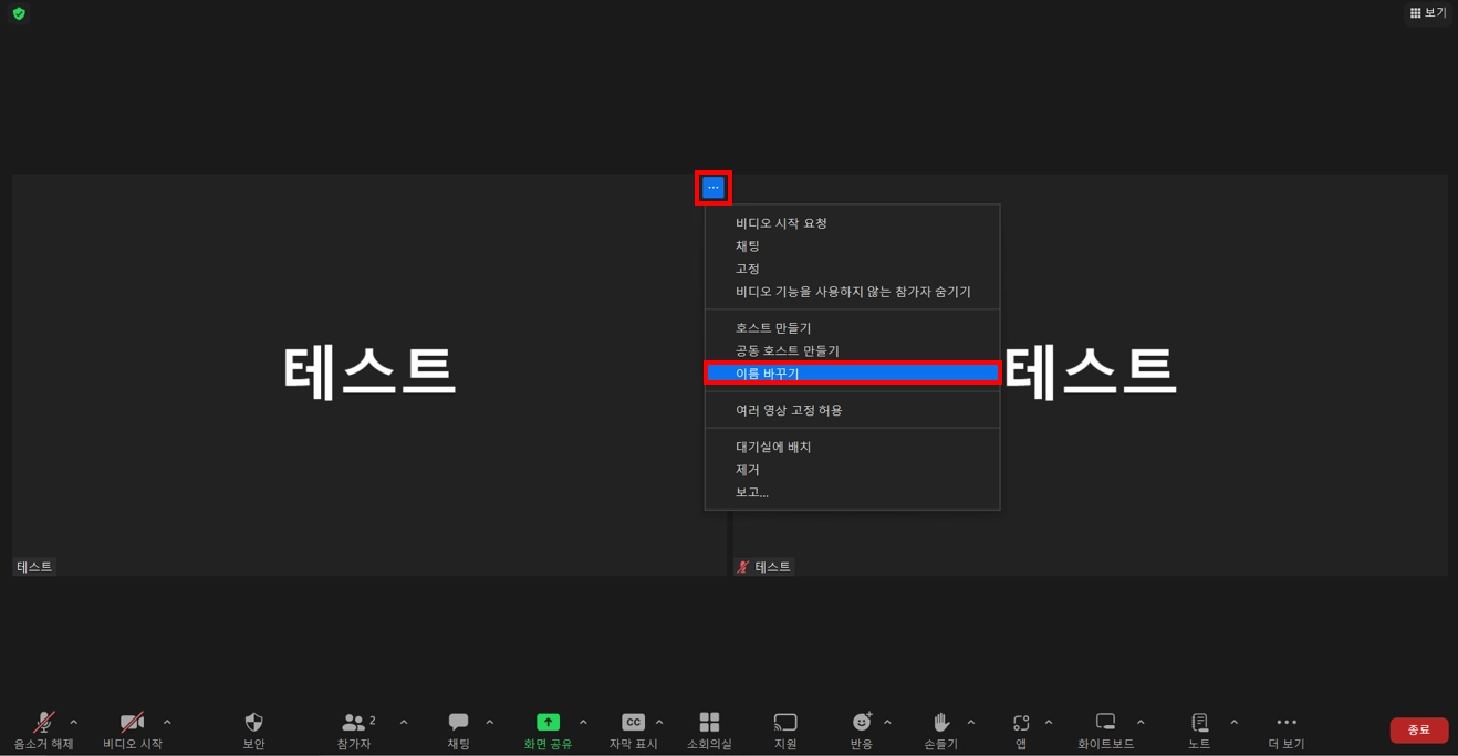 선생님께서 변경해 주시는 방법 : Zoom 회의실 하단 [참가자] or 화면 내 해당 수강생 이름 마우스 커서를 올려놓고 […] 클릭 > [이름 바꾸기] 클릭