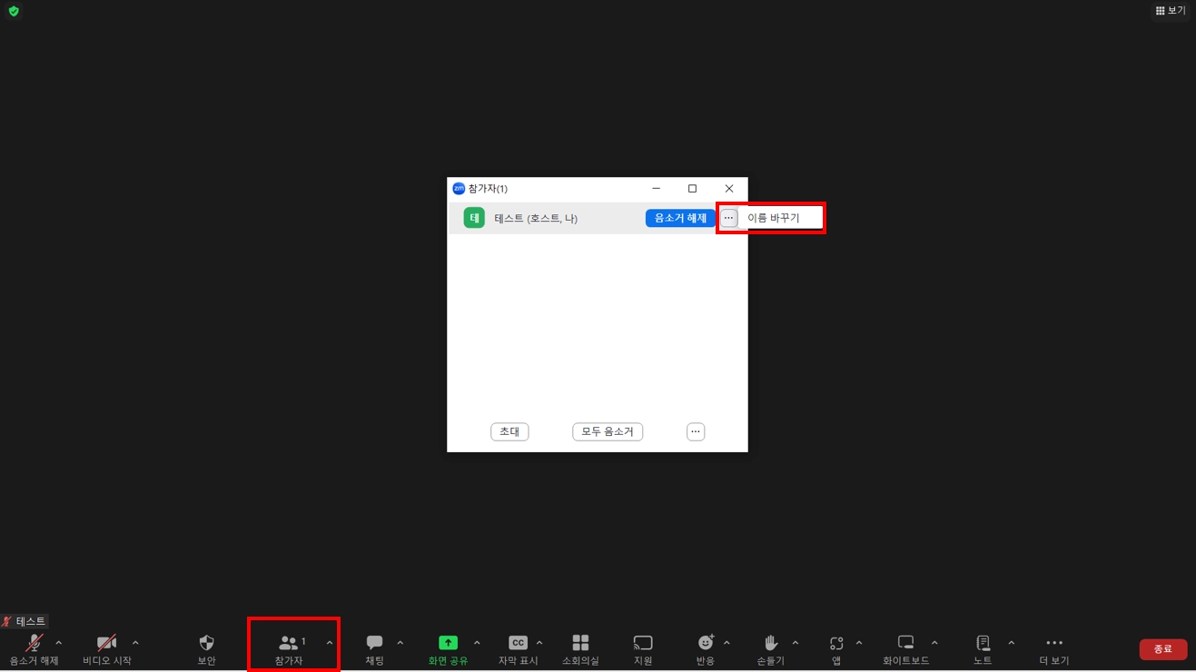 수강생이 직접 변경하는 방법 : Zoom 회의실 하단 [참가자] 버튼 > 내 이름 옆 마우스 커서를 올려놓고 […] 클릭 > [이름 바꾸기] 클릭