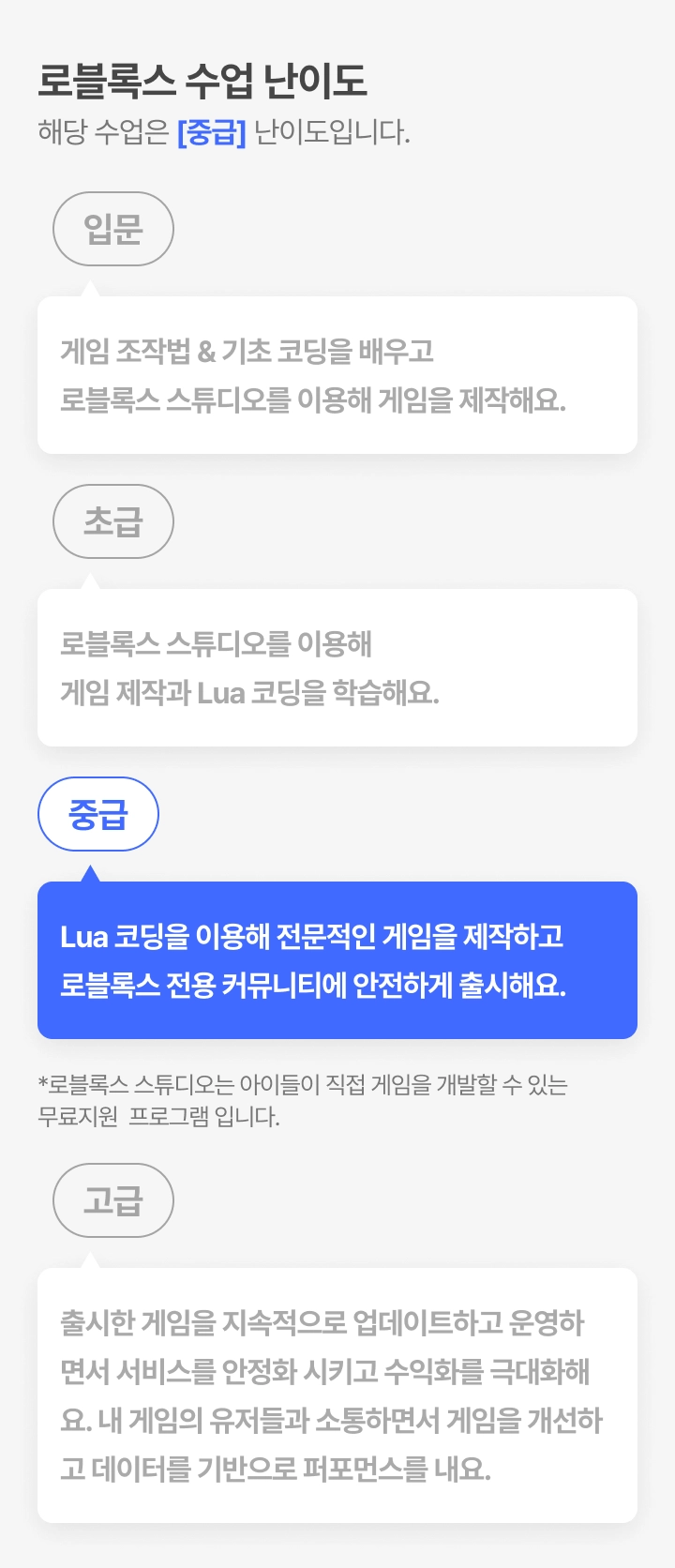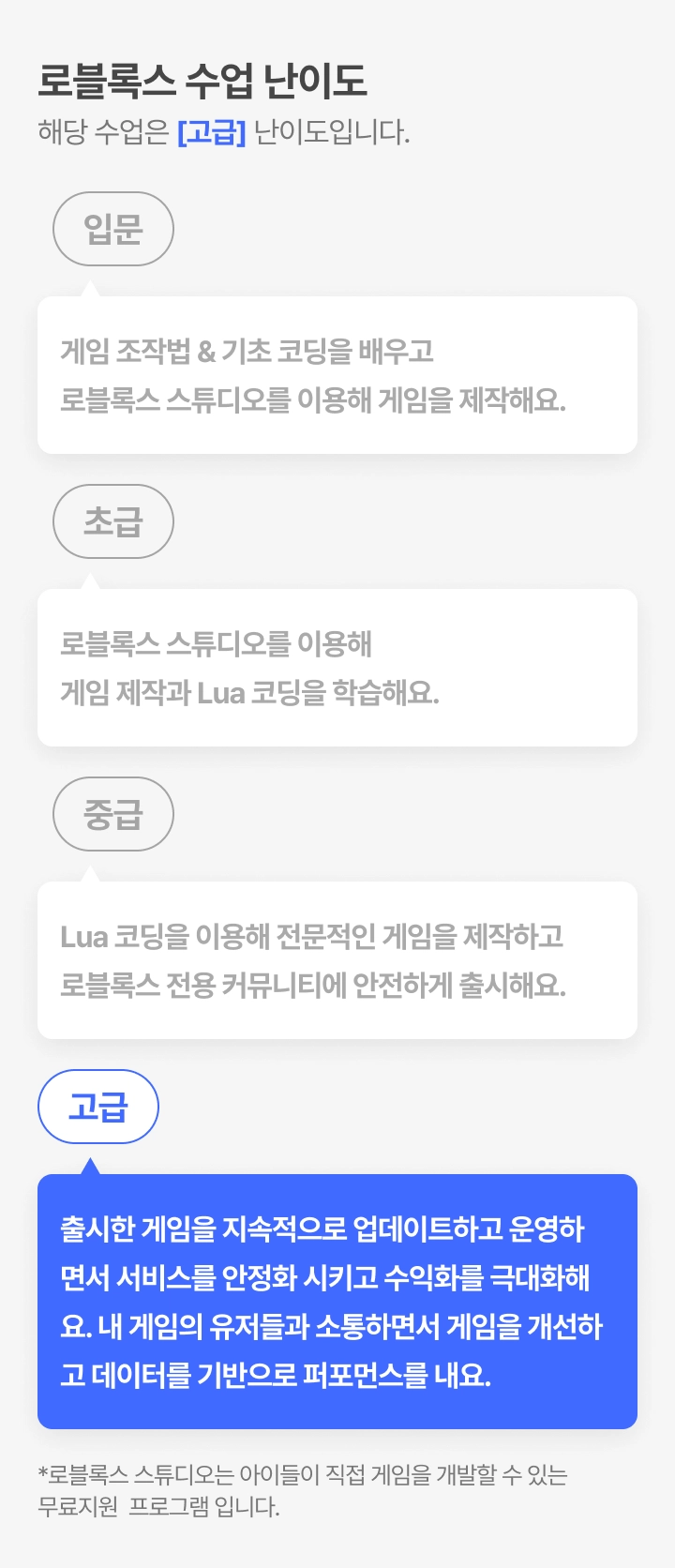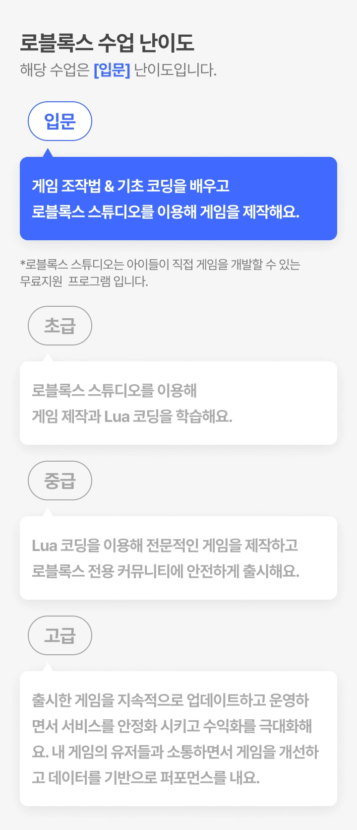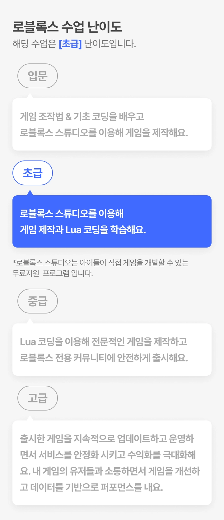 보다 만족스러운 수강 경험을 위해, 서비스 내에서 보편적으로 사용될 로블록스 난이도를 마련하였습니다.