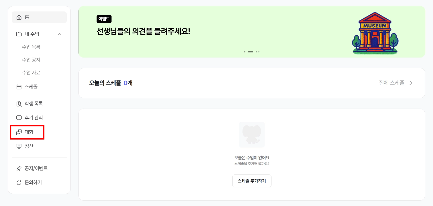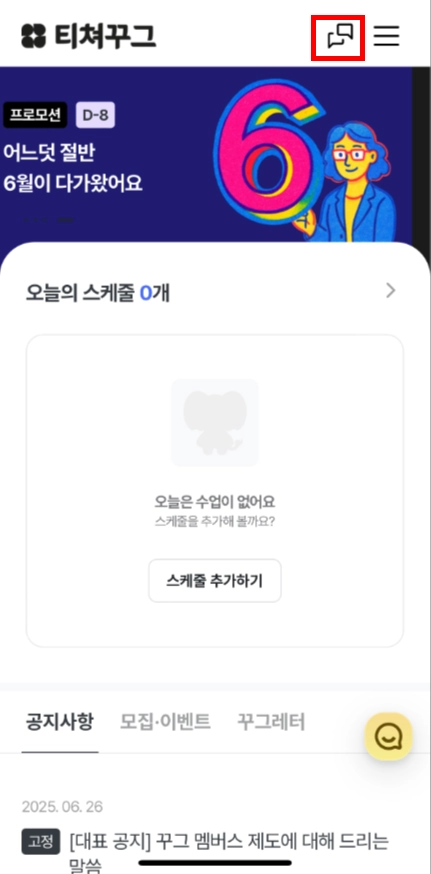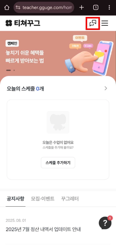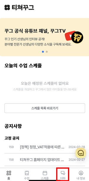 이미 티쳐꾸그 접속 후에 대화 페이지를 보고 계신 경우에는 알림이 발송되지 않을 수 있습니다.