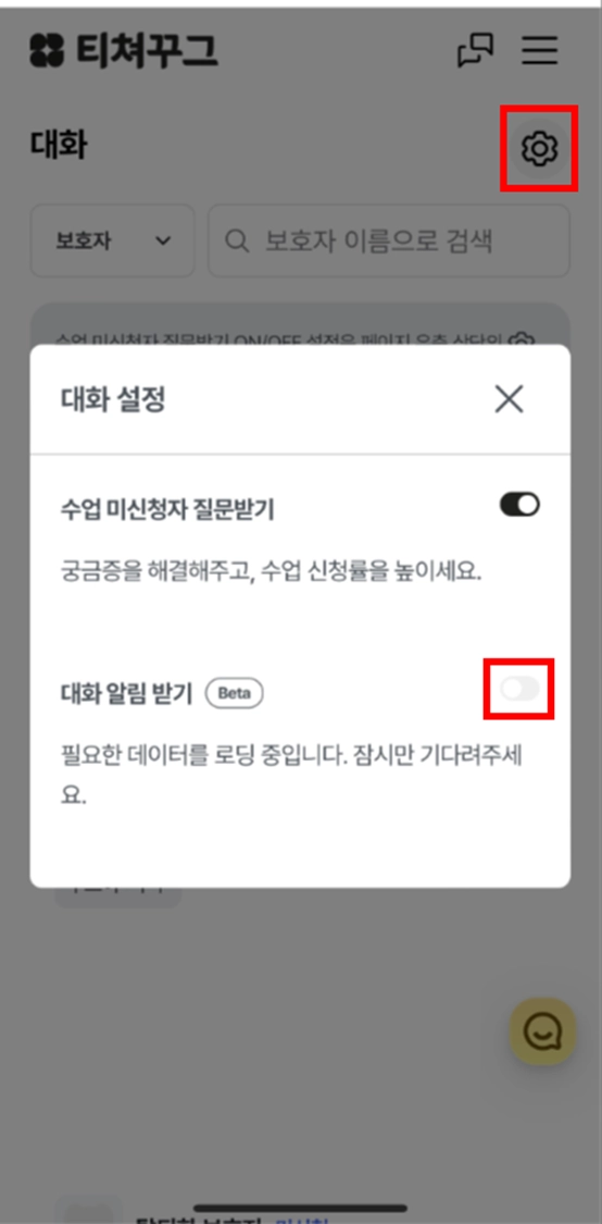 ‘필요한 데이터를 로딩 중입니다. 잠시만 기다려주세요.’ 라는 알림이 확인된다면, 알림 수신까지 다소 시간이 소요될 수 있습니다. 잠시 대기 후에 이용해주시거나, 로딩이 완료된 이후에 대화 알림 받기 토글이 ON으로 정상 설정되어 있는지 확인해주세요.