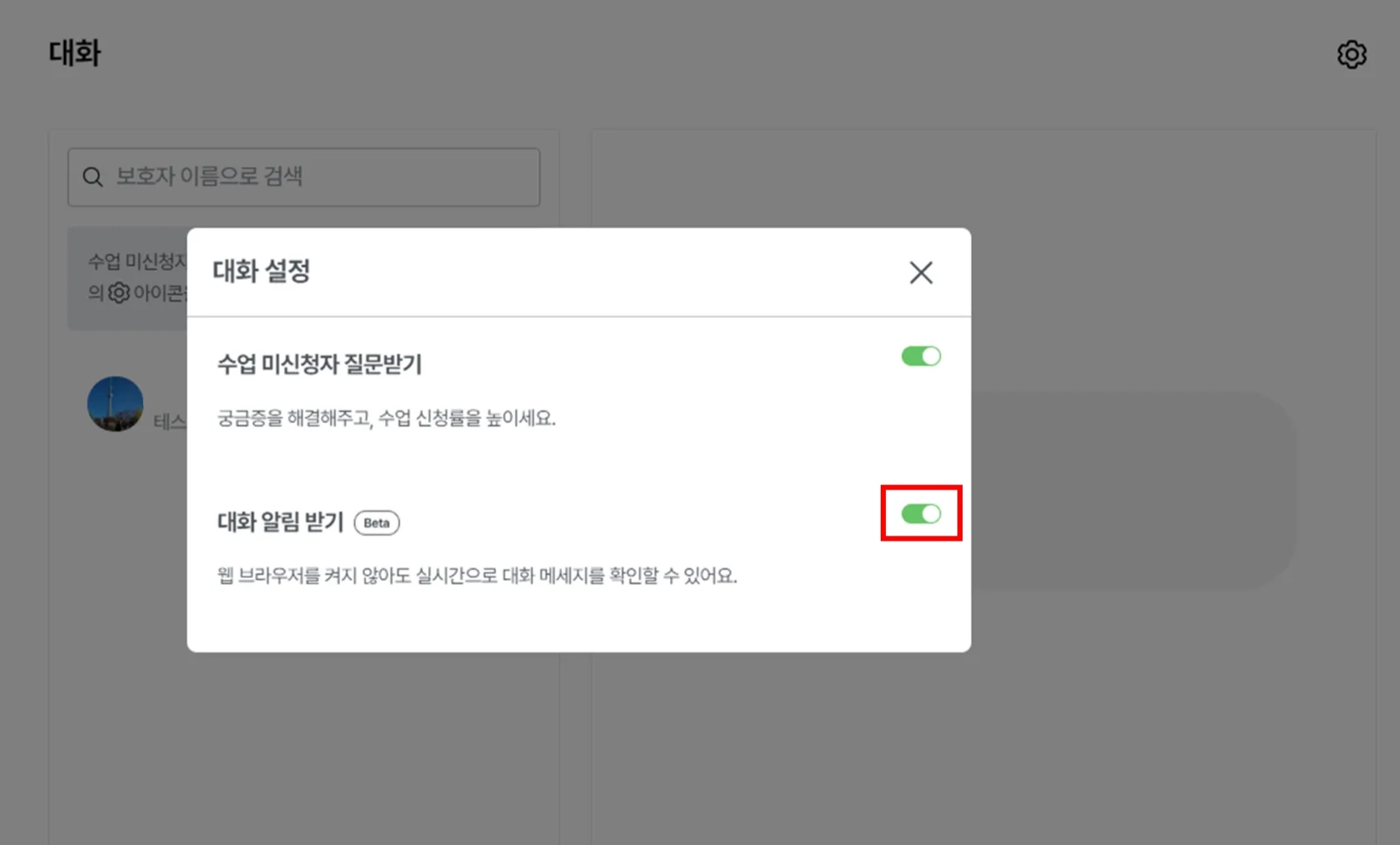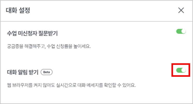 대화 알림 받기 설정 토글 > ON을 통해 설정 가능합니다.