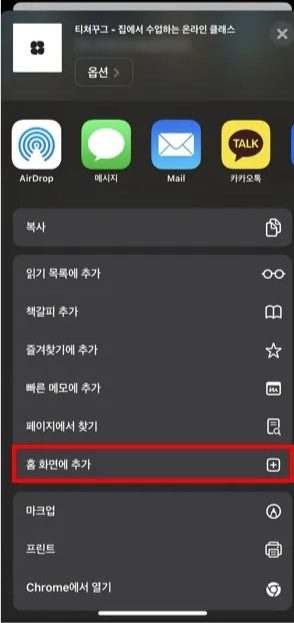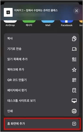 홈 화면에 추가 클릭합니다.