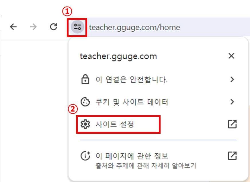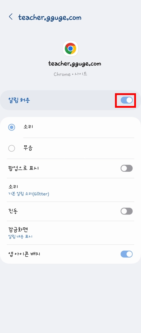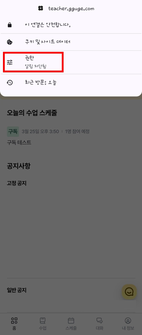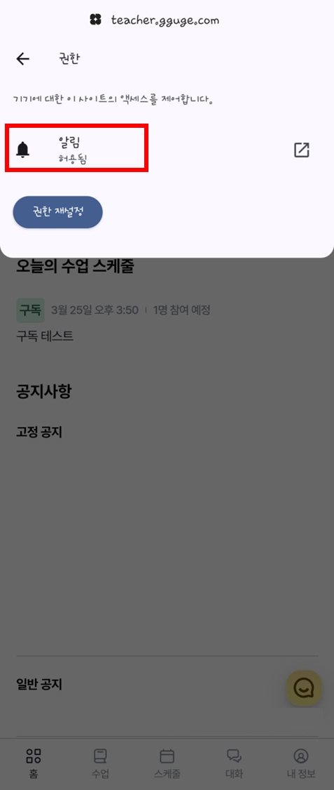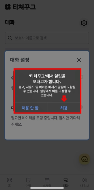 “티쳐꾸그”에서 알림을 보내고자 합니다.’ 팝업 화면 > 허용 클릭