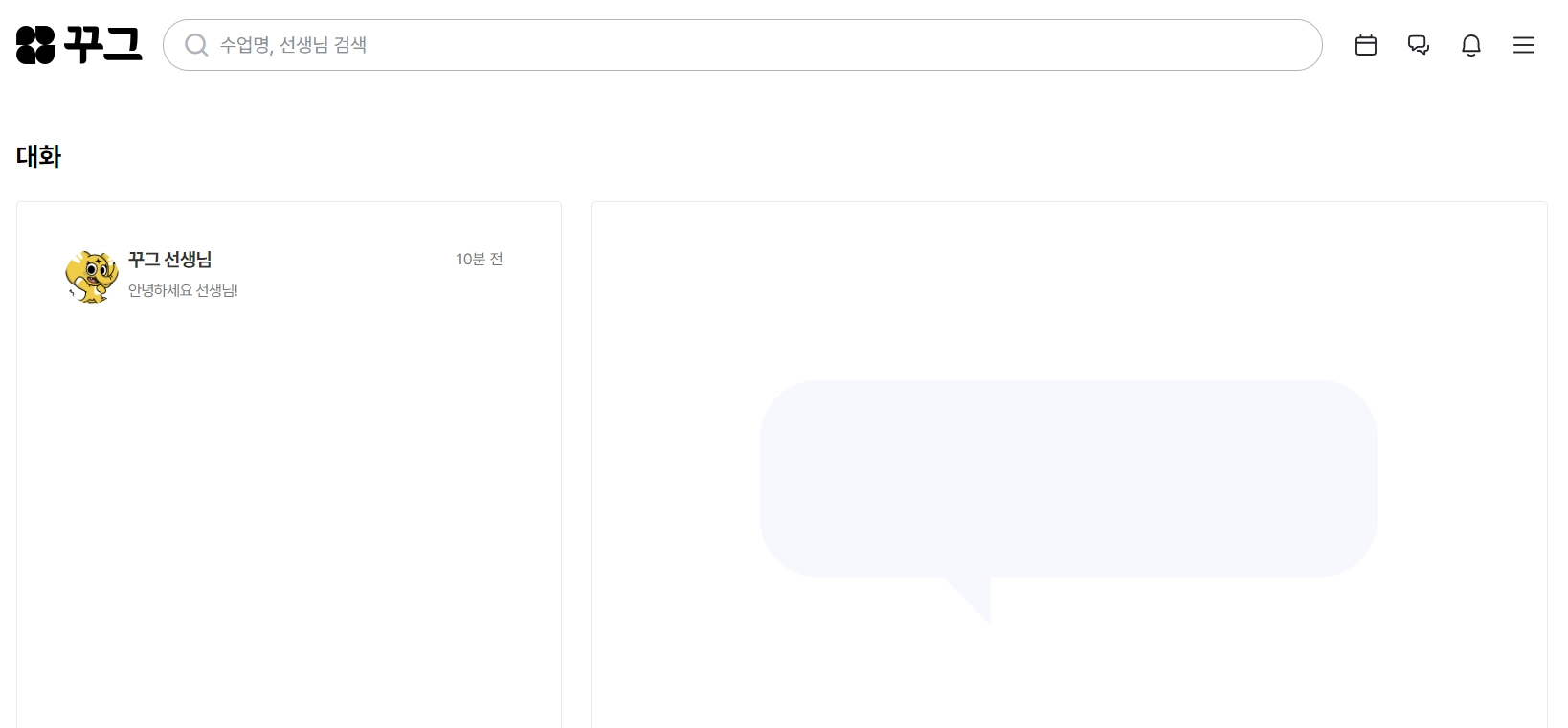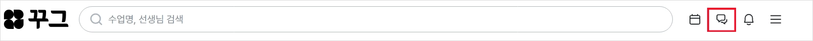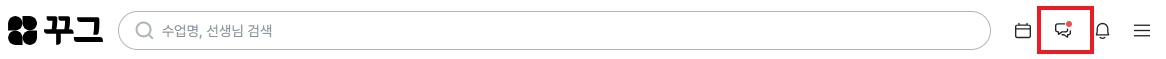 새로운 대화 메세지를 받으시면 [꾸그 홈페이지 > 우측 상단 말풍선 아이콘] 옆에 빨간 점이 표시됩니다.