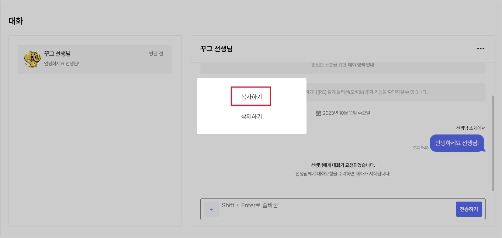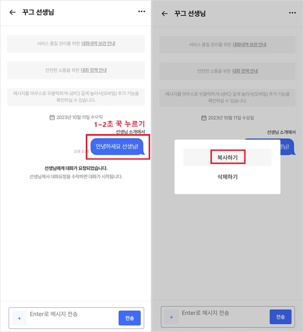 대화 중에 전송한 메세지, 또는 선생님에게 전송받은 메세지를 복사할 수 있어요.
