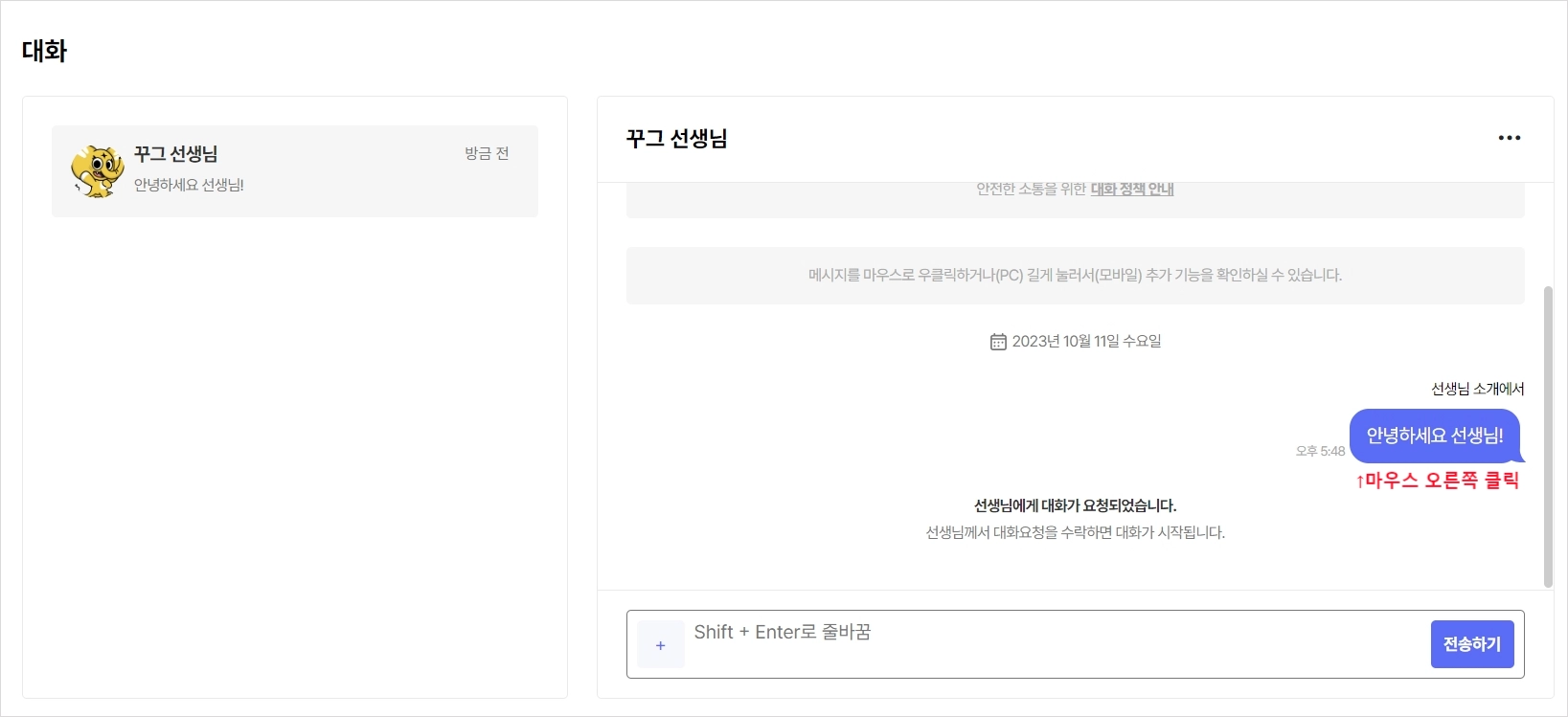 선생님에게 대화를 요청하고 싶으신가요? 아래 방법을 확인해주세요.