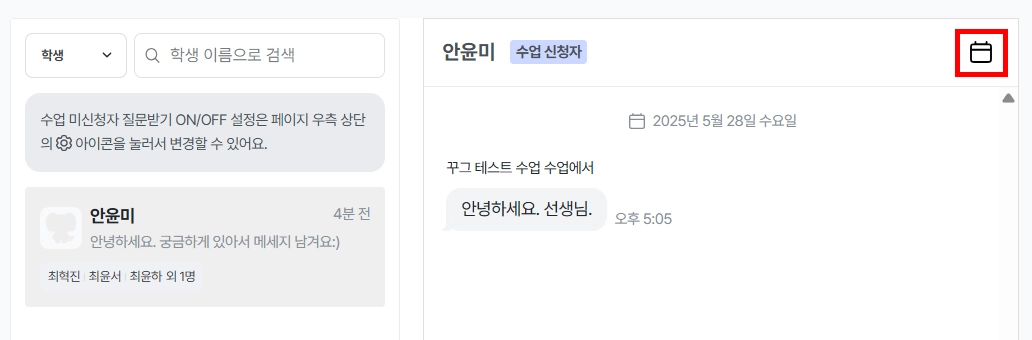 기능이 ON일 경우, 수업 미신청자는 선생님께 대화를 보낼 수 있습니다.