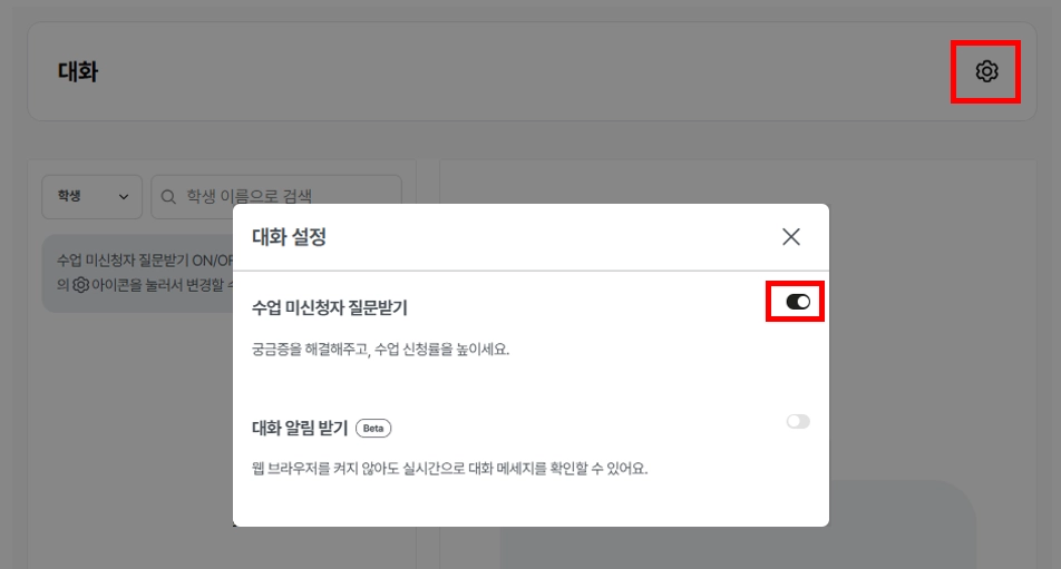 수업 미신청자 질문 받기 ON/OFF 설정은 [티쳐꾸그 홈페이지 > 좌측 메뉴 > 대화 > 우측 톱니바퀴 아이콘