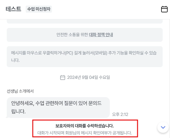 새로운 대화 메세지가 수신되면, 선생님의 첫 답장 여부가 대화 수락으로 간주됩니다.