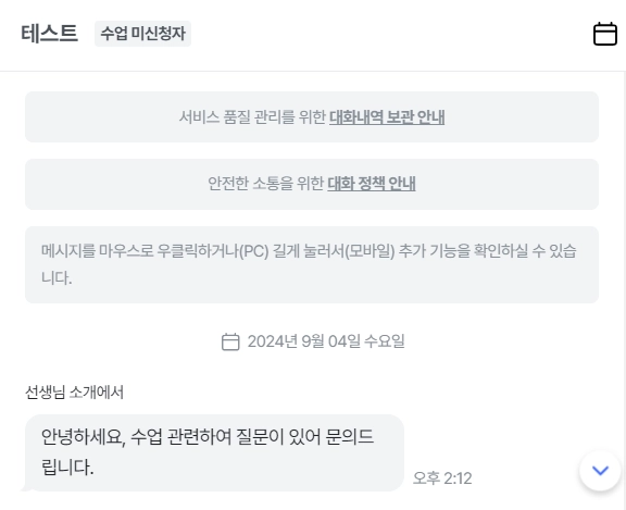 대화 기능은 보호자님과의 원활한 소통을 위한 공간으로, 수업과 관련된 목적에 한해 사용해 주세요.