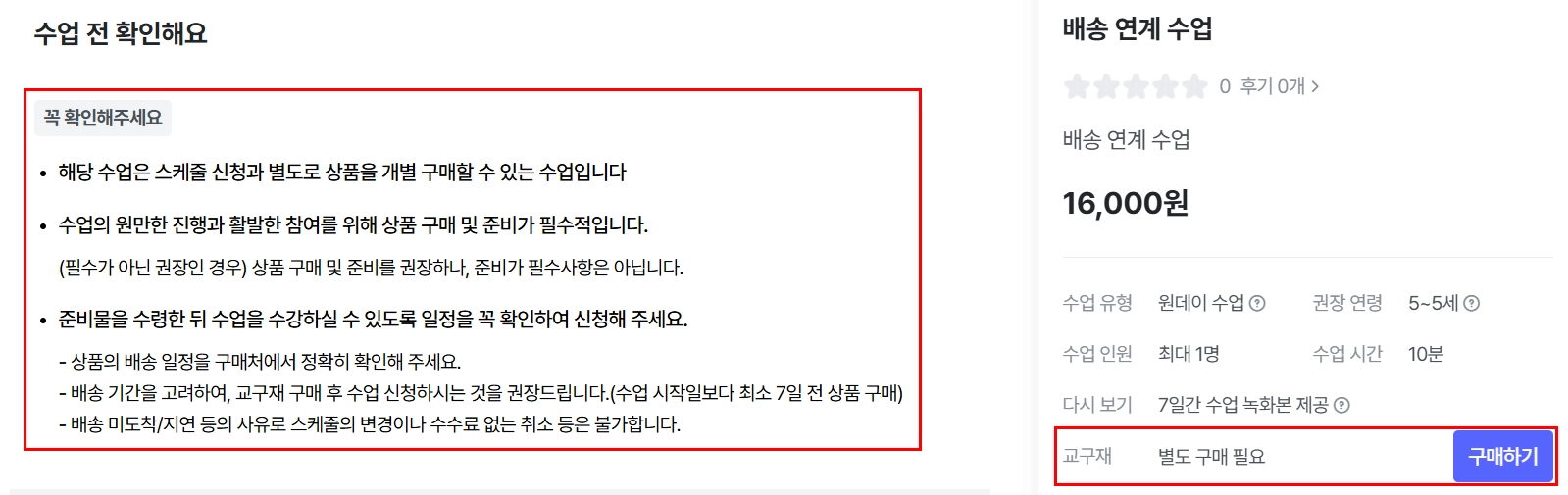 수업 승인 시, 교구재 링크 연결 및 상세페이지 내 배송 수업 신청 유의사항이 추가됩니다.