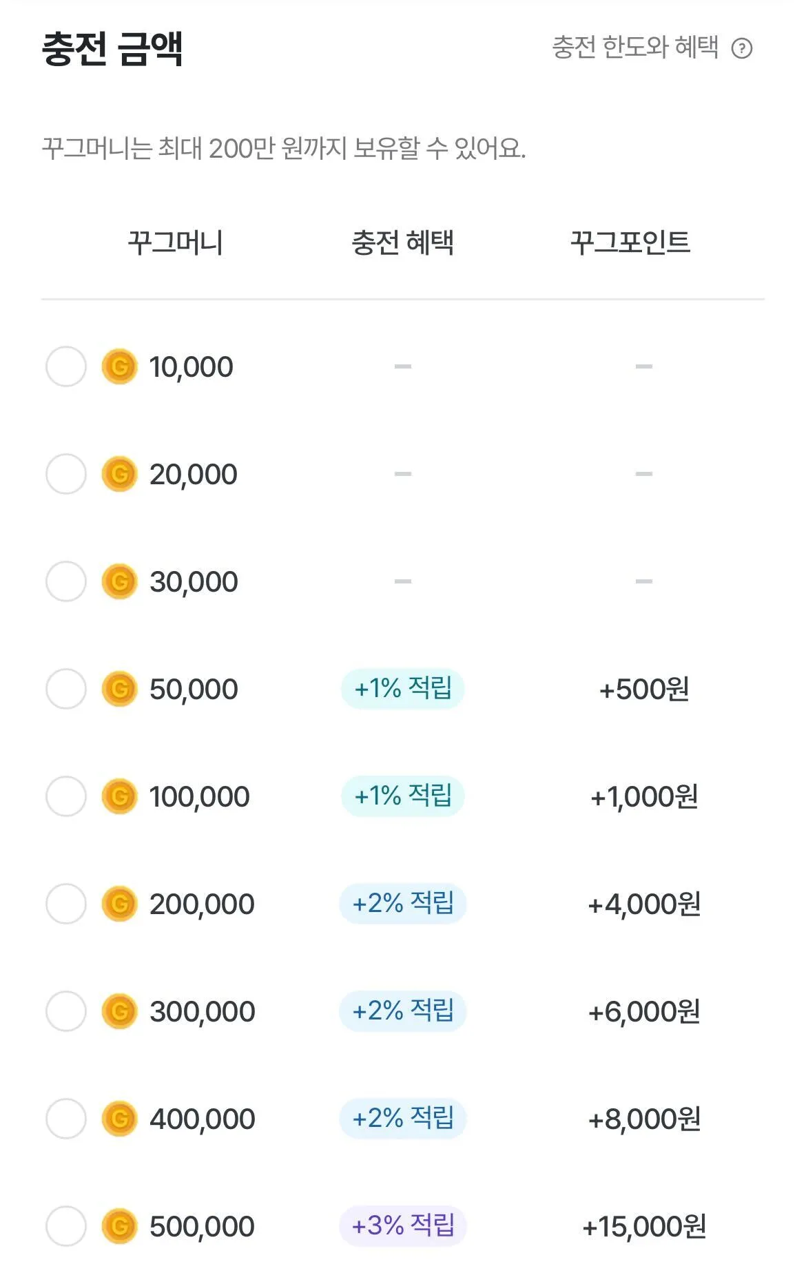 꾸그머니 충전 시 충전금액별 혜택금액을 지급해드리고 있어요. 혜택금액은 충전금액 구간별로 상이합니다.