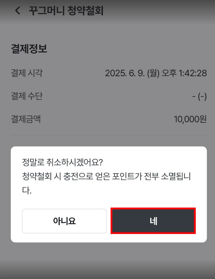 [정말로 취소하시겠어요?] 라는 알림이 노출되면 [네] 버튼을 클릭하여 청약철회를 완료해 주시면 됩니다.