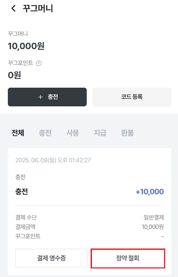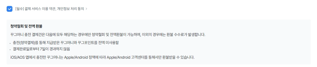 ※ 꾸그머니 전체 환불 시 충전으로 지급된 혜택금액은 전액 소멸되며, 꾸그머니 청약철회가 가능한 금액이 있어도 환불 수수료(환불 신청 금액의 10%와 1,000원 중 큰 값)를 제외하고 환불됩니다.