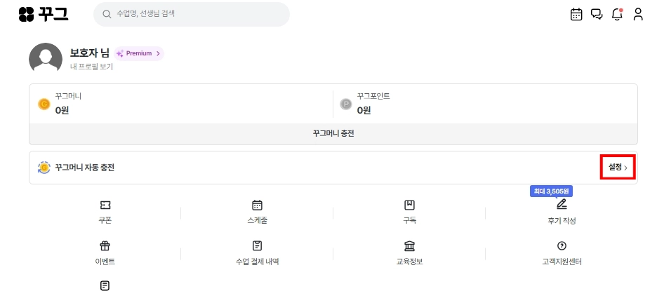 꾸그 홈페이지 > 마이 > 꾸그머니 자동충전 설정
