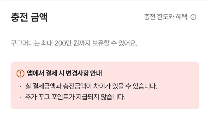 꾸그머니 충전 시 카드사마다 결제 한도가 다르게 설정되어 있어요.