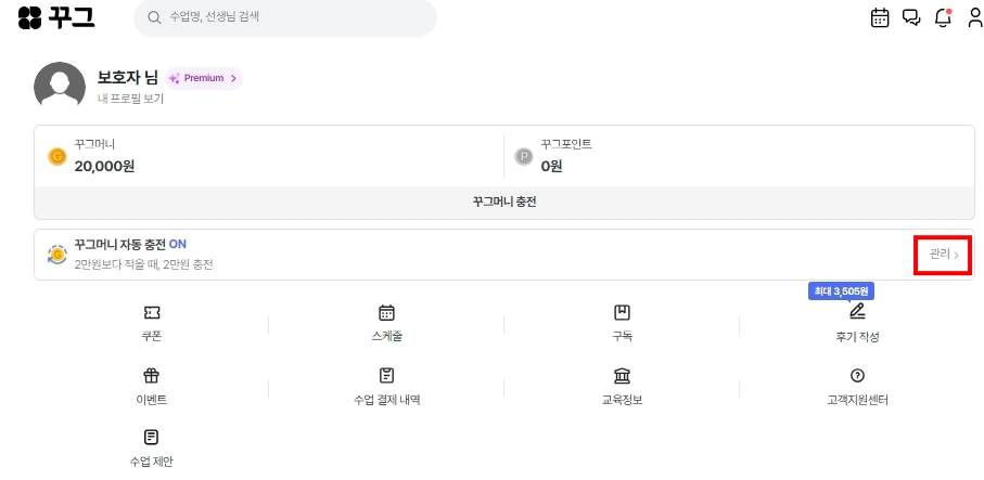 꾸그 홈페이지 > 마이 > 꾸그머니 자동충전 > 관리