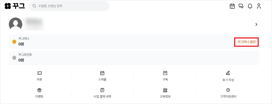 [꾸그 홈페이지 > 마이 > 꾸그머니 충전하기] 버튼을 클릭해 주세요.