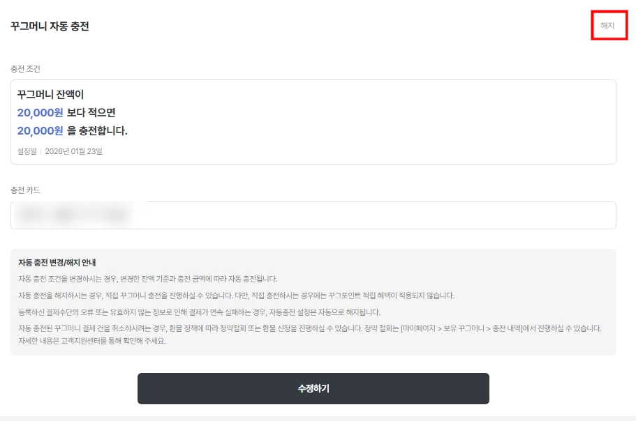 3-1. 꾸그머니 자동충전 해지하기