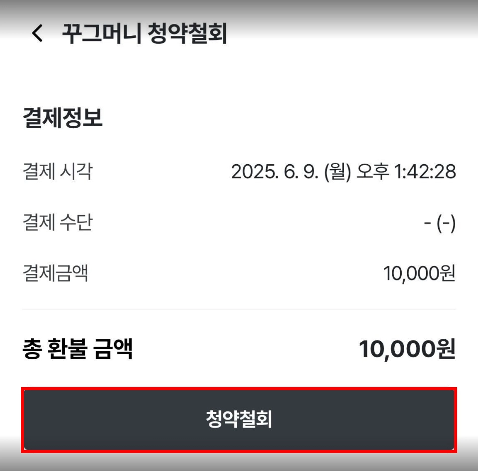 꾸그머니 청약철회 페이지에서 결제 수단 및 결제 일시를 확인하실 수 있으며 [청약철회] 버튼을 클릭해 주세요.