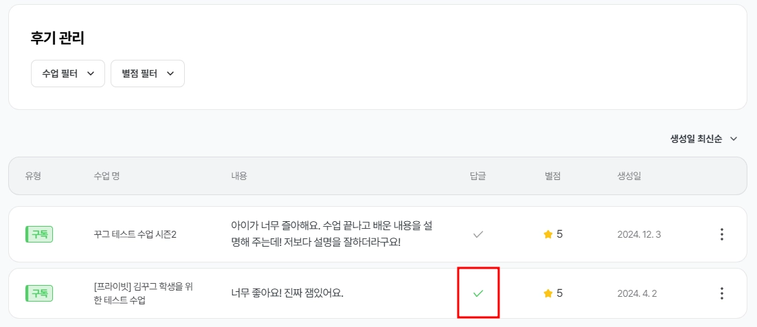 [티쳐꾸그 홈페이지 > 좌측 메뉴 > 후기 관리 > 후기 우측 ⁝ > 답글 달기 > 답글 내용 작성]